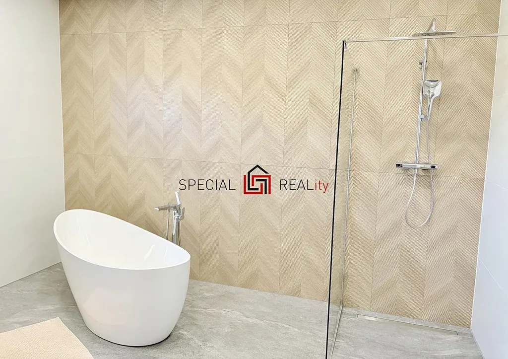- dům nabízí dvě koupelny, v přízemí s walk-in sprchovým koutem a samostatným WC, v patře s volně stojící vanou, walk-in sprchovým koutem a WC