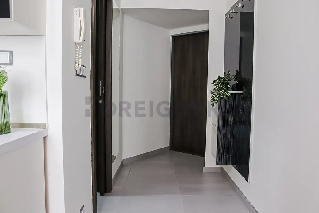 Byt se nabízí částečně vybavený, kde kuchyňská linka disponuje moderními spotřebiči jako je sporák, trouba, mikrovlnka, lednička s mrazničkou, digestoř, klimatizace. V koupelně najdete umyvadlo, toaletu, sprchový kout a pračku. Ve vstupní chodbě je velká vestavěná skříň. Majitel je ochoten byt dovybavit po dohodě.