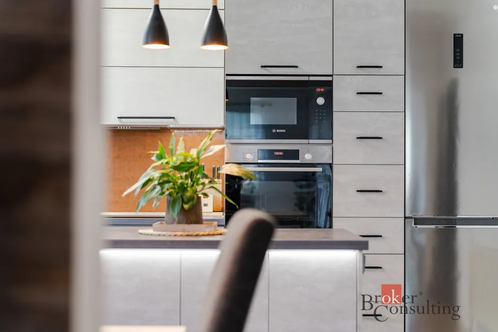 Horní byt zaujme moderní kuchyní, která přirozeně spojuje rodinu a stává se centrem každodenního života.