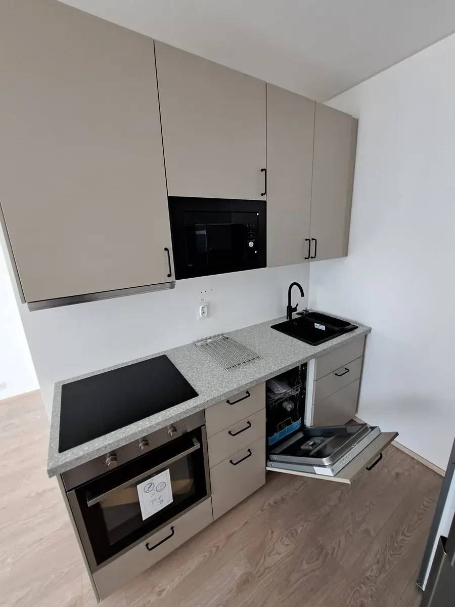 Nová kuchyňská linka se spotřebiči (lednička s mrazákem, varná deska, digestoř, elektrická trouba, MV trouba, myčka, dřez, baterie), pokoj (skříně IKEA), koupelna (sprcha, umyvadlo se skříňkou, zrcadlo, závěsné WC, topný žebřík), chodba (skříně IKEA, příprava na pračku), světla, venkovní žaluzie.