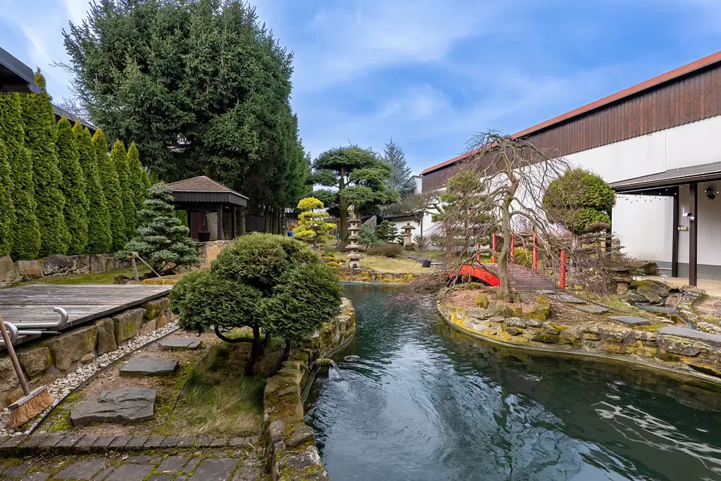 Zahrada v pojetí feng-shui nabízí prostor pro relaxaci a odpočinek. Nalezneme zde zastřešené sezení, ohniště, dřevník a studnu. Dominantu zahrady tvoří jezírko s celoroční filtrací pro okrasné japonské ryby kapr koi.