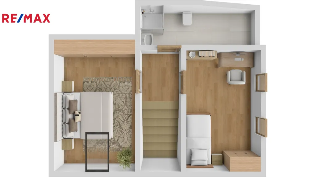 Po otevřeném schodišti se dostaneme do obytného podkroví, kde se nachází: dva samostatné pokoje, koupelna se sprchovým koutem a WC.