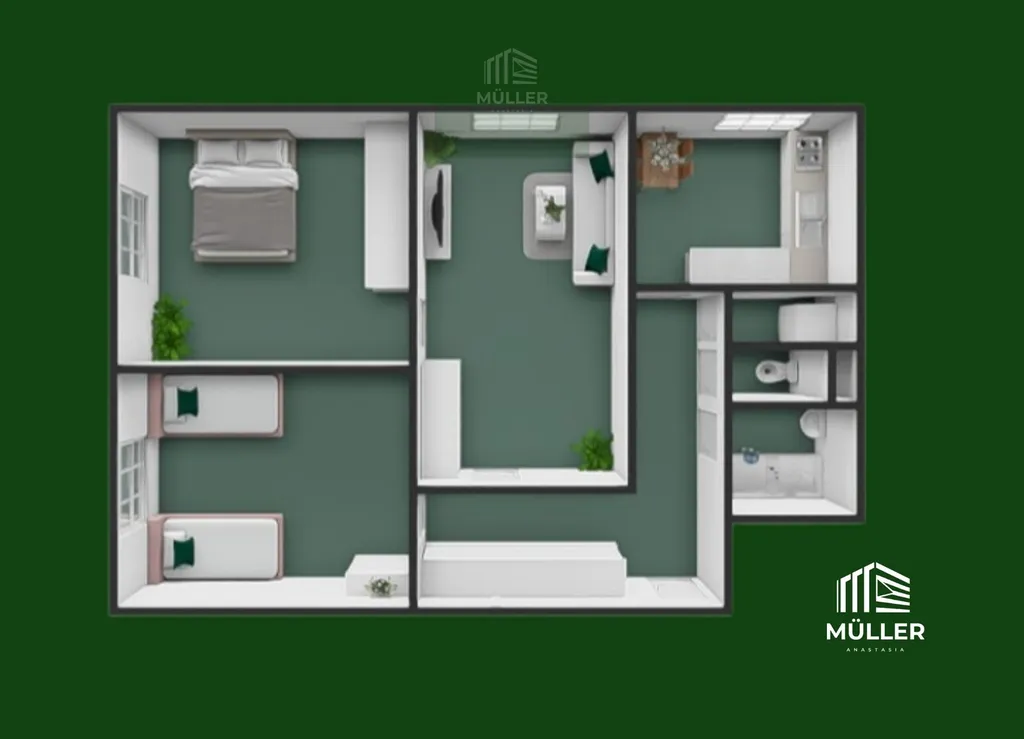 Dispozice bytu nabízí oddělenou koupelnu a toaletu, což je velkou výhodou zejména pro rodinu nebo více osob. Interiér působí velmi světlým a vzdušným dojmem díky dostatku denního světla.
