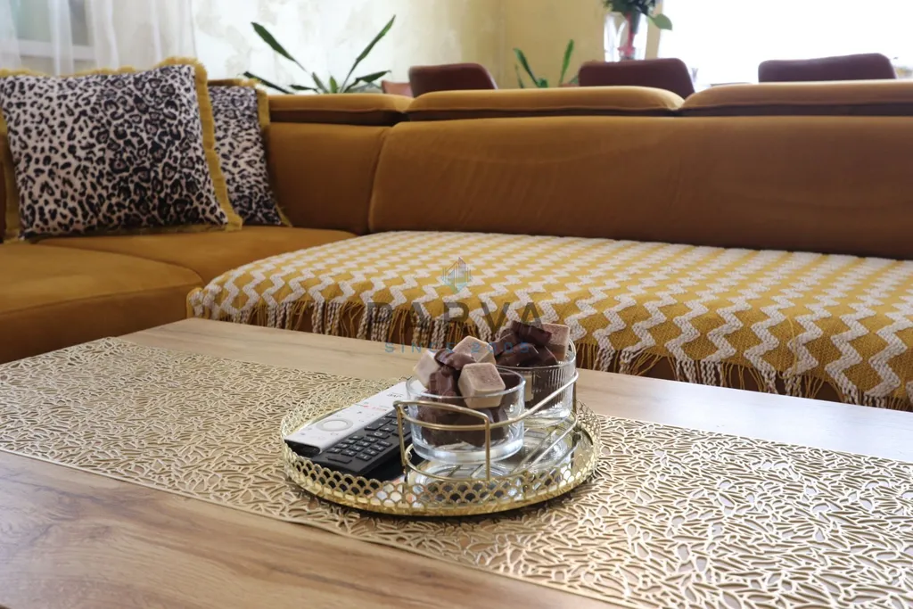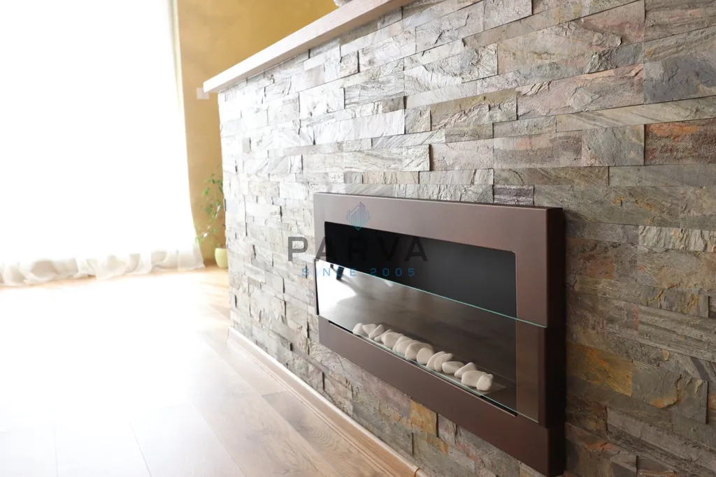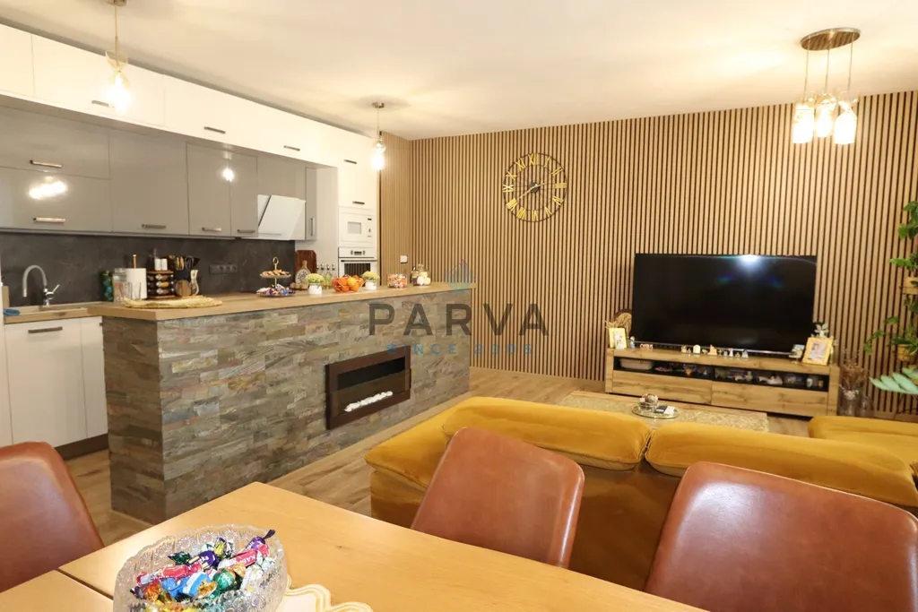 Interiér bytu byl navržen s důrazem na detail a nadčasovou eleganci. V části bytu, konkrétně v chodbách a kuchyni, jsou použity benátské omítky, které prostoru dodávají jedinečný charakter. Kuchyňský ostrůvek je navíc doplněn o designový lihový krb, jenž vytváří příjemnou atmosféru a podtrhuje celkový dojem z prostoru.