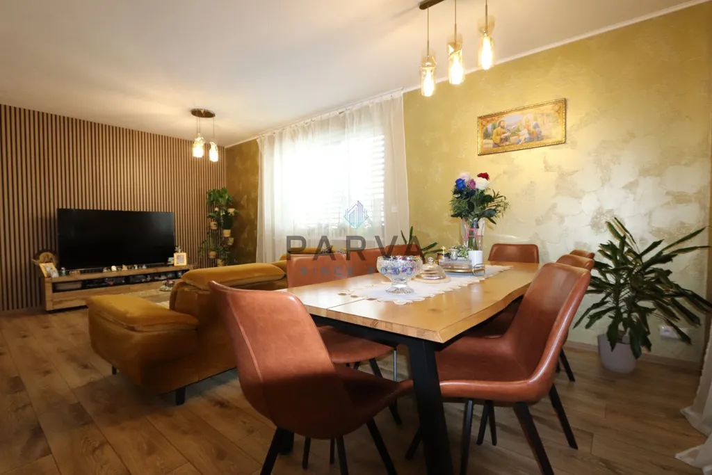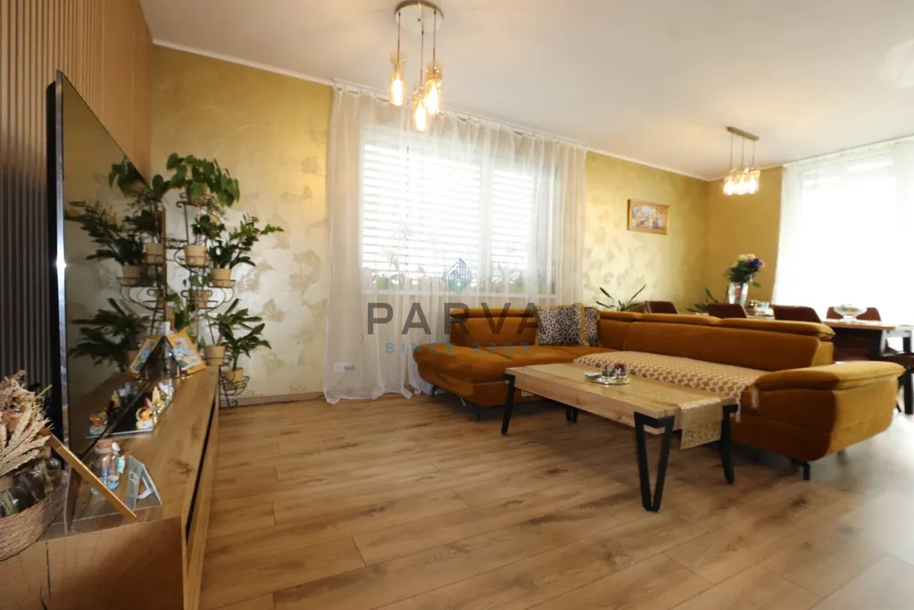 Byt nabízí velkorysou podlahovou plochu cca 118 m² o dispozici 5+kk, kterou doplňuje prostorná terasa o velikosti 30 m². Dispozice je promyšlená do detailu – dominantou je hlavní obytný prostor s kuchyňským koutem o velikosti téměř 36 m², který přirozeně navazuje na terasu a tvoří srdce celého bytu. Dále zde najdete ložnici, dva další pokoje, šatnu, koupelnu, samostatné WC, technickou místnost a dvě chodby, které zajišťují pohodlné oddělení jednotlivých zón.