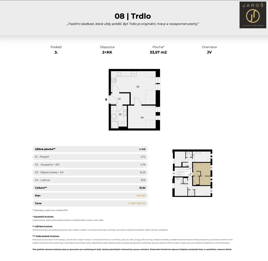 Nabízíme k prodeji moderní byt v osobním vlastnictví o dispozici 2+kk s celkovou výměrou 33,57 m². Byt se nachází ve 3. nadzemním podlaží nově vznikajícího projektu Rezidence Stará pekárna v Jáchymově. Dispozice tohoto bytu 08 | „Trdlo“ zahrnuje vstupní chodbu, obývací pokoj s přípravou na kuchyňský kout, koupelnu se sprchovým koutem, toaletou a přípravou na pračku a ložnici. Byty jsou nabízeny ve vysokém standardu s důrazem na kvalitní materiály a moderní provedení (viz webové stránky projektu – standardy).