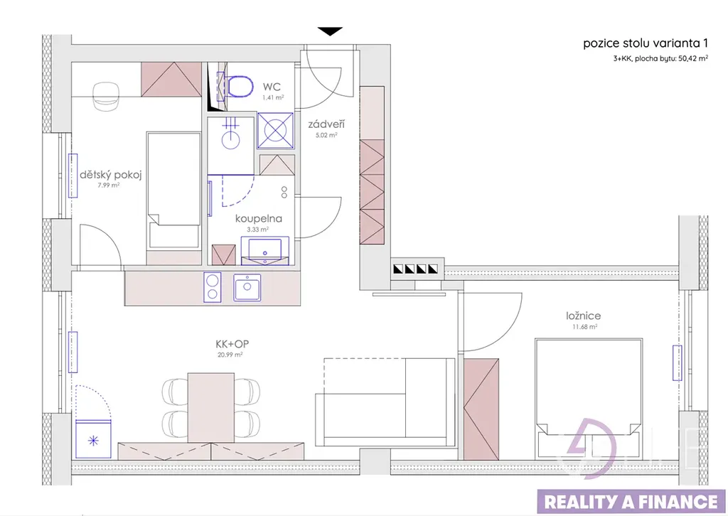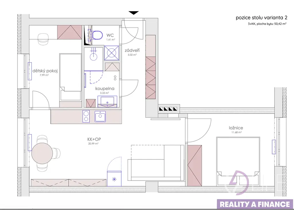 Byt je částečně zařízený – součástí je kuchyňská linka a nábytek v koupelně, na WC a v zádveří.
