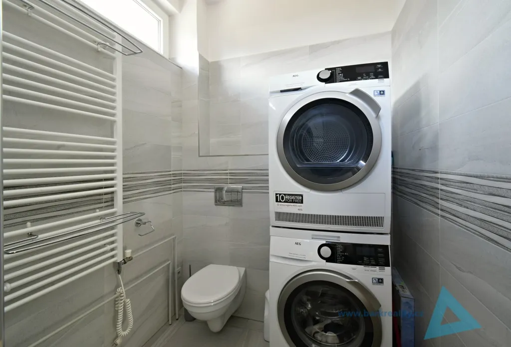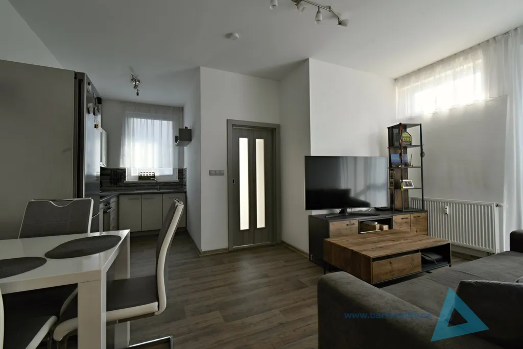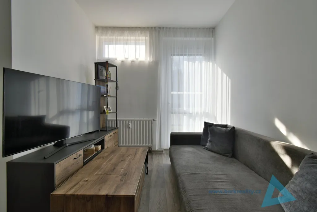 Dispozice: obývací pokoj s kuchyňským koutem (indukce, trouba, mikrovlnná trouba, myčka), ložnice s vestavěnou skříní, koupelna se sprchovým koutem, WC a přípravou na pračku, vstupní chodba s úložnými prostory. Byt prošel rekonstrukcí cca před 5 lety.