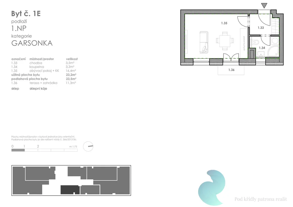 Nabízený byt č. B-1B o dispozici 1+kk, výměře 23,3 m2 s předzahrádkou 13,3 m2, se nachází v přízemí budovy B. Disponuje vstupní chodbou, obývacím pokojem s kuchyňským koutem,