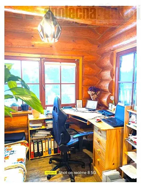 Nabízíme k prodeji jedinečný srubový dům v klidné přírodě a těsné blízkosti Prahy. Dům je řešen jako dvougenerační, v přízemí dispozice 2kk s prostornou koupelnou se sprchovým koutem i masážní vanou, dále úložné prostory a technické zázemí. Horní 2 patra tvoří jeden celek s dispozicí 4kk, koupelna opět s masážní vanou i sprchovým koutem. Z hlavní místnosti vstup a prostornou a zčásti krytou terasu. Obě bytové jednotky mají samostatné vchody zvenčí. Na pozemku dále rekreační chatka, použitelná k občasnému přespání návštěv. Dům vytápěn interierovým kotlem Verner nejvyšší řady, který je připojen k akumulační nádrži a systému podlahového vytápění v obou jednotkách. Dolní byt ale lze otočením kohoutu oddělit a vytápět samostatným elektrokotlem, horní byt rovněž připojen k samostatnému elektrokotli. Kromě toho ještě ve spodní jednotce kachlema obezděná krbová vložka, která ji také samostatně bez problémů vytopí. V horní jednotce zase navíc kachlový sporák s troubou. V celém domě dřevěná eurookna, v přízemí ještě opatřena elektrickými předokenními roletami.