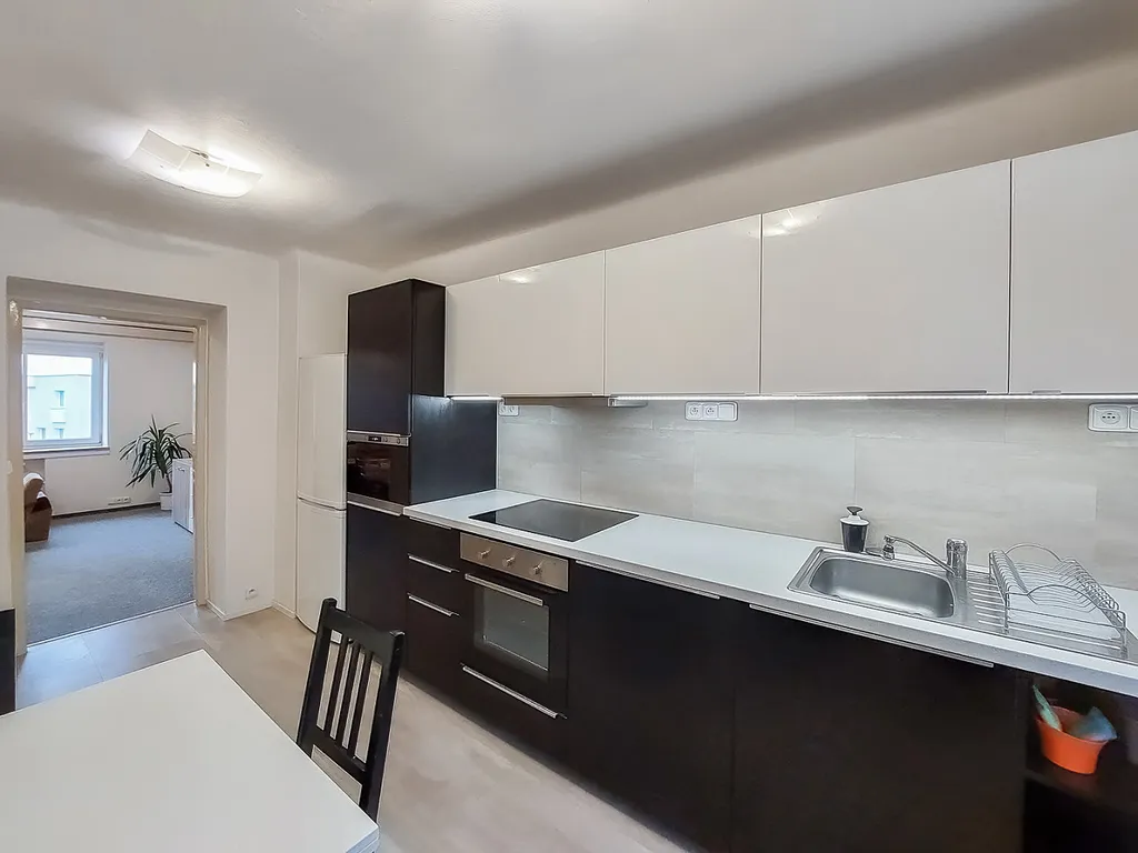 Byt se nachází v klidném bytovém domě obklopeném zelení. K dispozici je vybavená kuchyň (varná deska, trouba, mikrovlnná trouba, lednice s mrazákem, jídelní stůl) a součástí vybavení je také pračka. K bytu náleží sklep.
