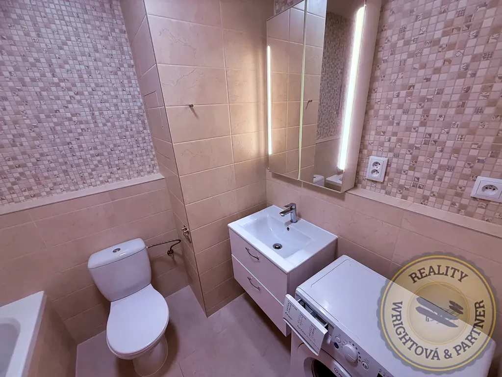 • koupelna s vanou, toaletou, umyvadlem a pračkou,