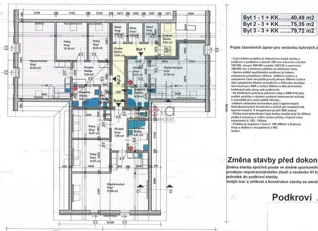 V patře jsou připraveny k dobudování 3 bytové jednotky a to 2+1, 2+1 a 2+kk.