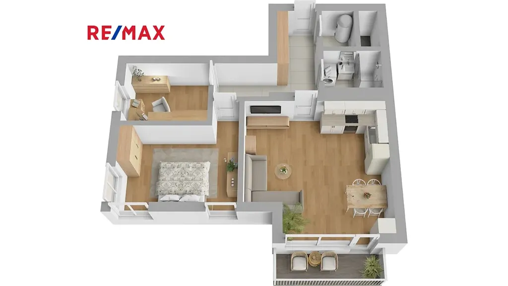 Byt je z části zařízený s dostatkem úložných prostor.