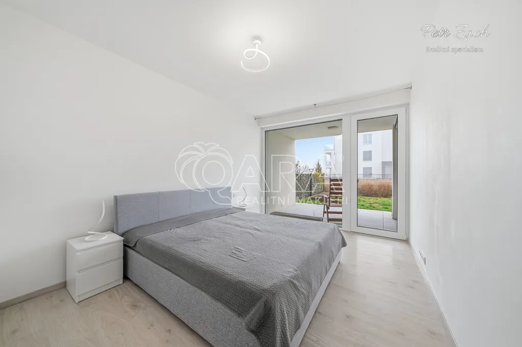 Dominantou bytu je prostorný obývací pokoj s kuchyňským koutem, který je vybaven kuchyňskou linkou se spotřebiči (myčka, trouba, lednice). Díky velkým oknům je prostor krásně prosvětlený a působí velmi vzdušně. Ložnice nabízí dostatek soukromí a klidu. Velkým benefitem bytu je také prostorná šatna, která poskytuje dostatek úložného prostoru. Koupelna je moderně řešená a součástí bytu je také samostatné WC. Velkou výhodou bytu je přímý vstup na venkovní prostor (zahrádka/terasa), který poskytuje ideální místo pro odpočinek, ranní kávu nebo posezení s přáteli.