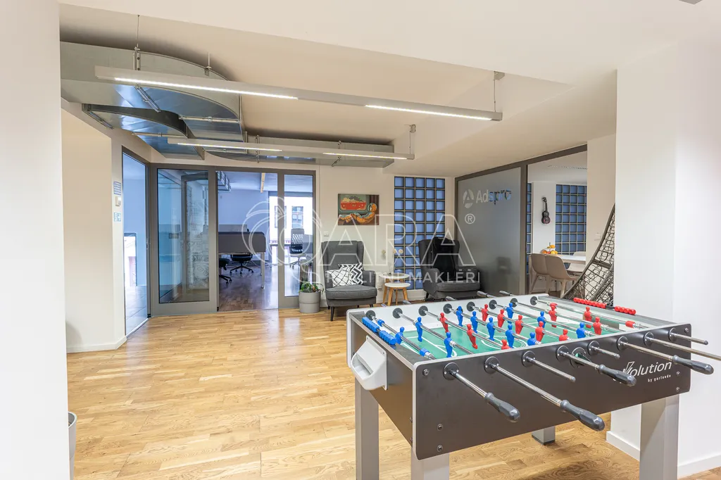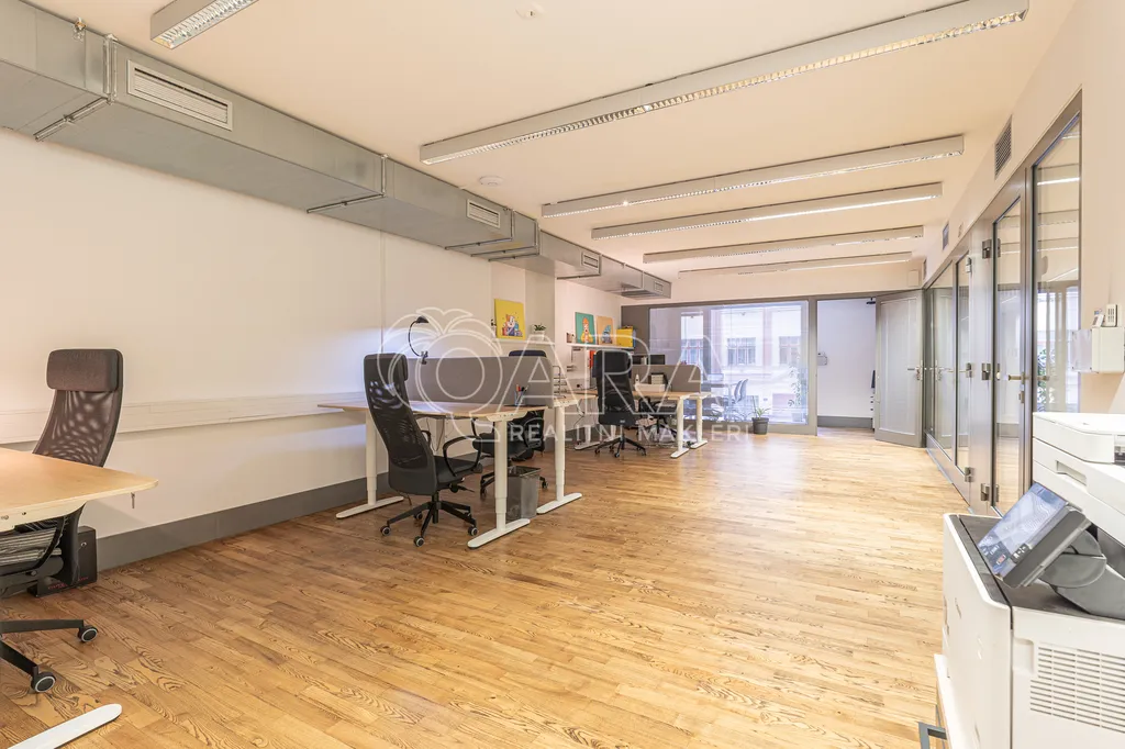 Prostor o celkové rozloze kanceláří 335 m² je klimatizovaný. Dispozice nabízí dvě větší otevřené místnosti, dvě místnosti oddělené skleněnou stěnou, přičemž jedna z nich má vstup na terasu o velikosti 17 m², samostatnou uzavřenou místnost, zasedací místnost a prostor pro recepci či posezení návštěv. Zázemí zahrnuje kuchyňku, jídelní kout, 2x moderní sociální zařízení se sprchou, serverovnu a úklidovou místnost.