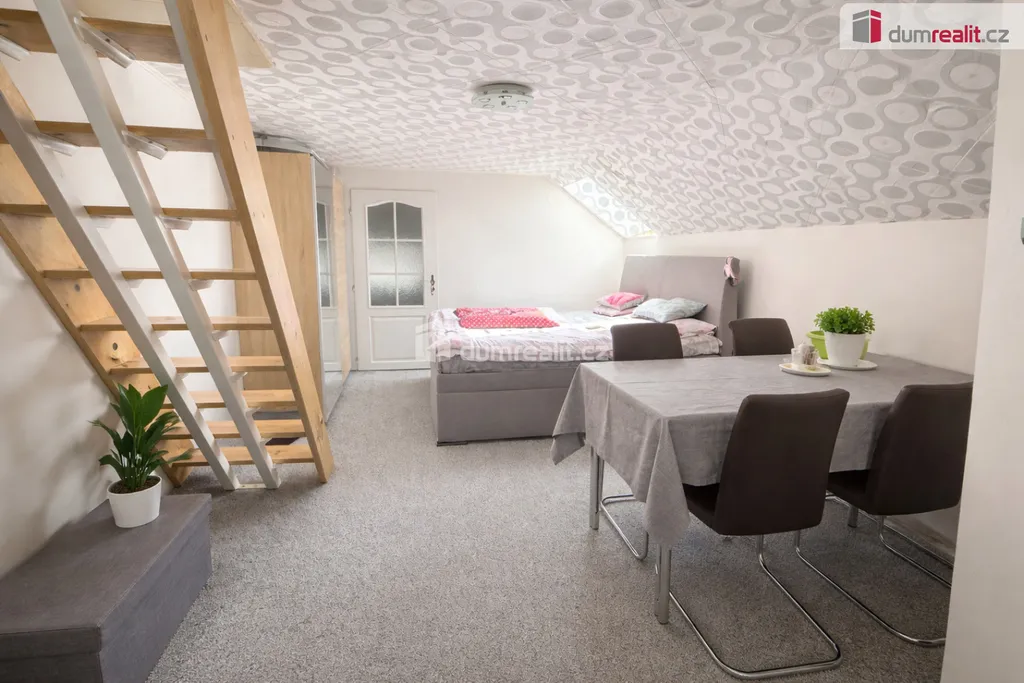 V prvním patře je samostatná bytová jednotka s dispozicí zahrnující ložnici, obývací pokoj, kuchyň, koupelnu a toaletu.