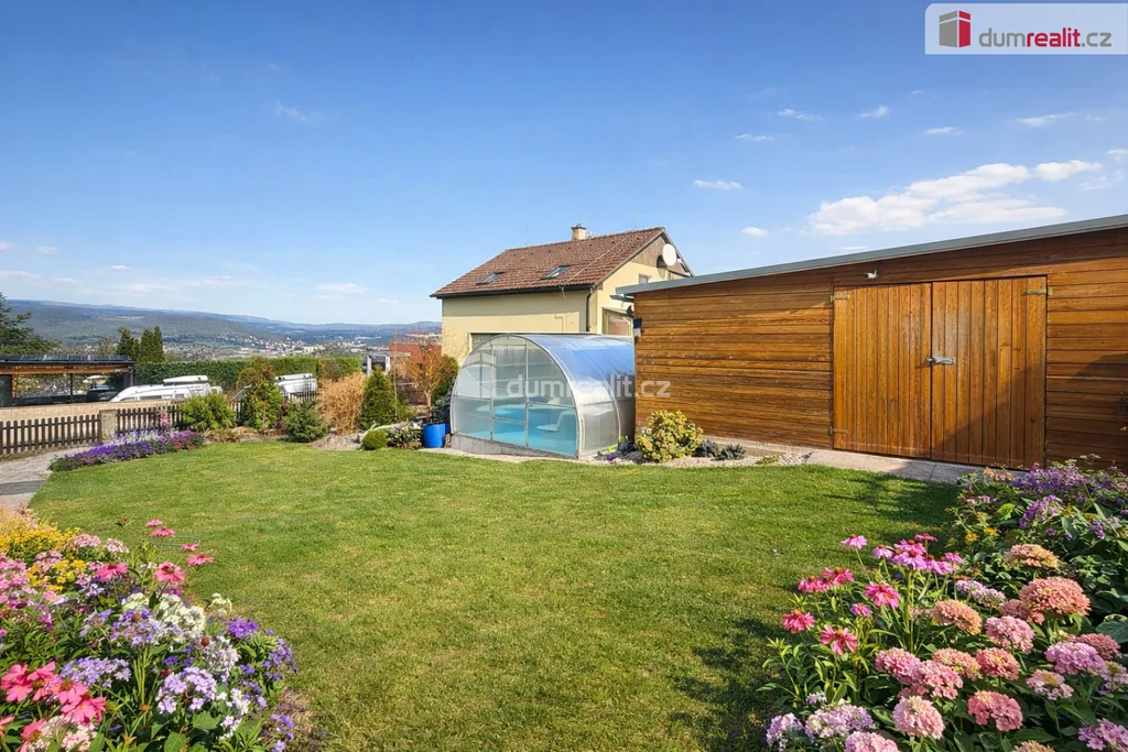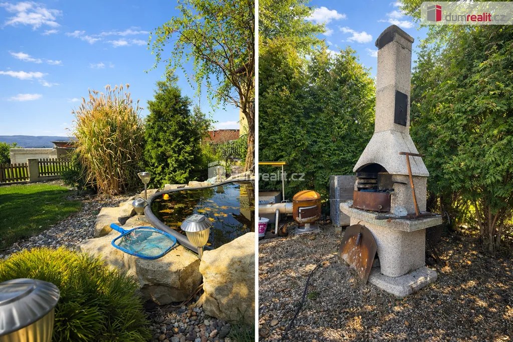 Dům je zasazen do krásně udržované, vzrostlé zahrady plné zeleně, okrasných květin a stromů, která poskytuje naprosté soukromí i prostor pro relaxaci. Na zahradě najdete bazén, útulný zahradní domek s krbem pro posezení i samostatný domek na nářadí. Velkým benefitem je také dechberoucí výhled na celé Ústí nad Labem.