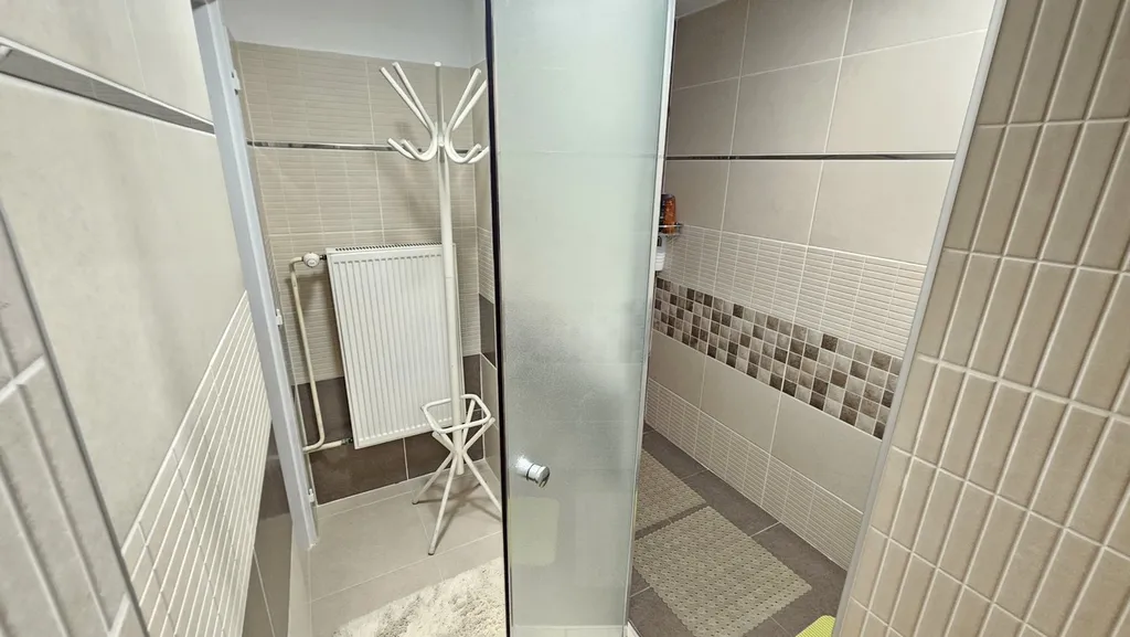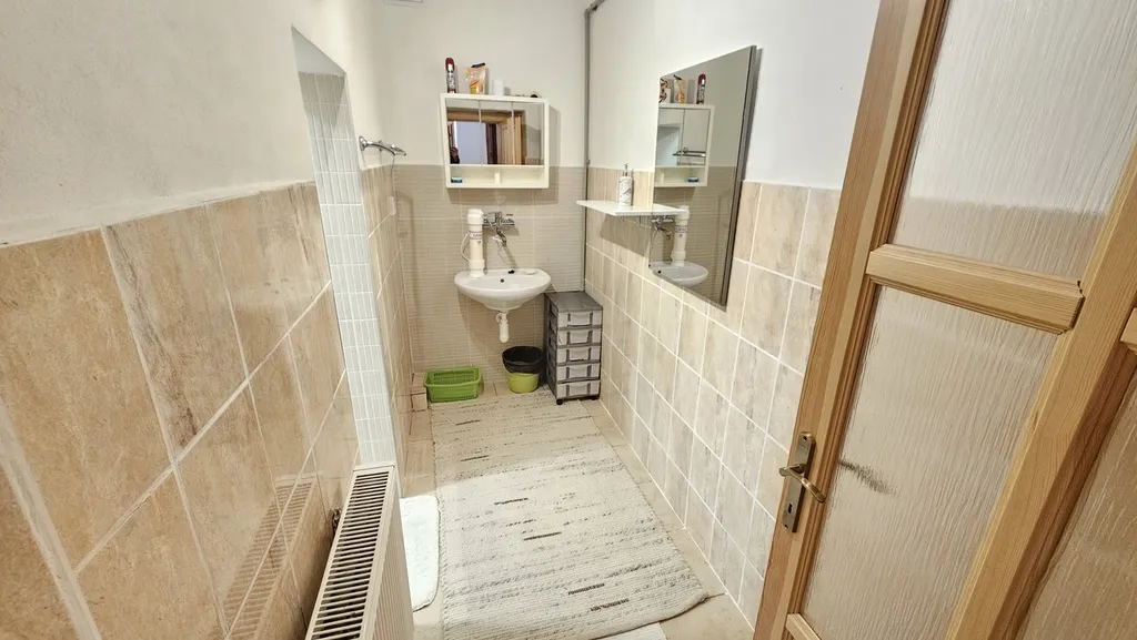 První část tvoří prostorná vstupní chodba s kamny. Z chodby je vstup do dětského pokoje, ložnice a velké koupelny vybavené vanou, sprchovým koutem, toaletou a bidetem.