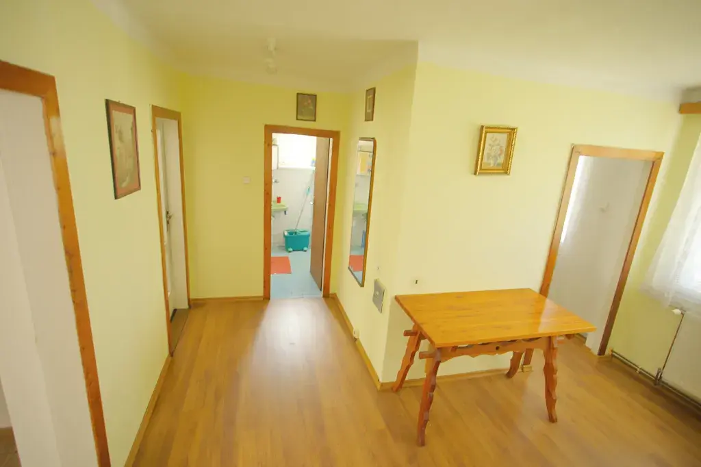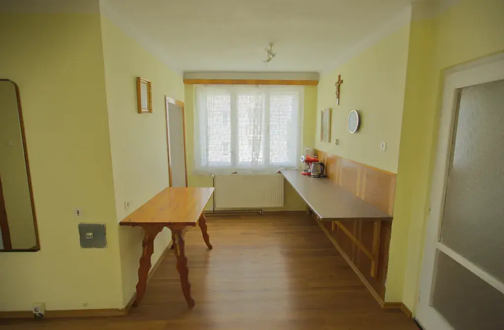 V prvním patře je obývací pokoj(18,6 m2), ložnice(14 m2), kuchyně(5,6 m2), spíž(1,4 m2) velká chodba( 12,3 m2), wc s koupelnou(3,58 m2), zádveří(3,39 m2) a balkon. V podkroví je obytná kuchyně(16,4 m2) a jeden pokoj(9,3 m2) a balkon.