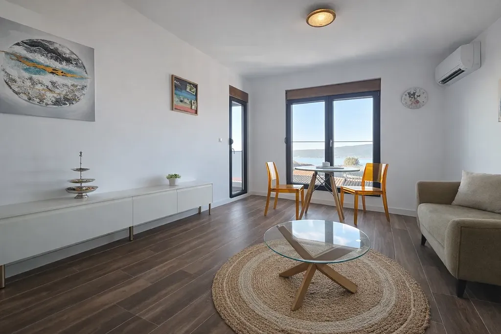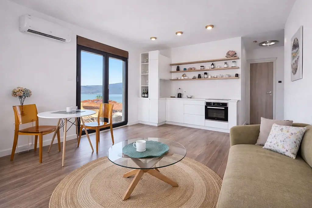 Apartmán je umístěn ve 3. patře moderní budovy a nabízí úchvatný panoramatický výhled na moře a celou Bokokotorskou zátoku. Součástí je soukromá garáž i vlastní parkovací stání, což zajišťuje maximální komfort a bezpečí.