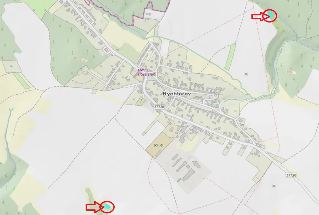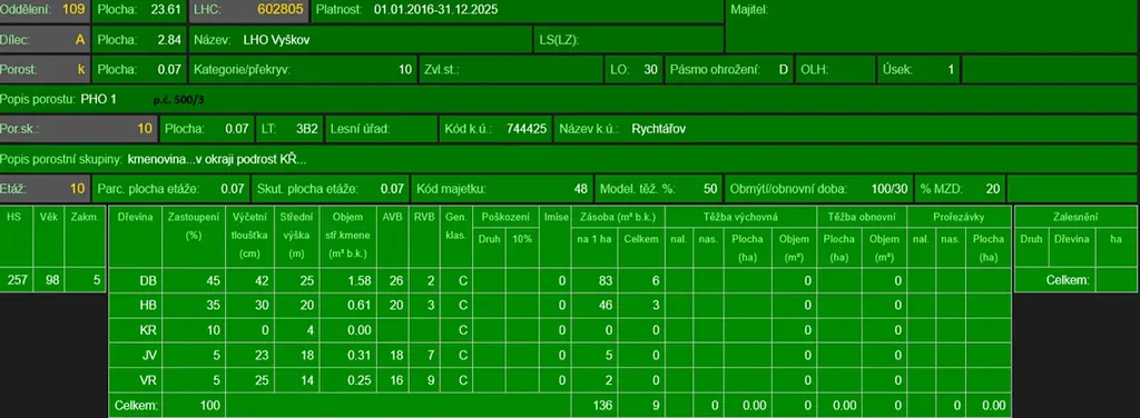 - p.č. 500/3 vedená jako lesní pozemek o celkové výměře 723 m2 (stáří lesa 108 let - zastoupení dřevin dub, habr, javor, vrba),