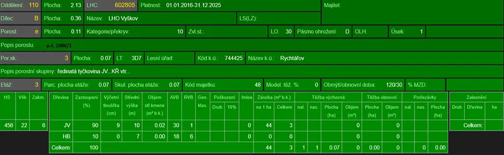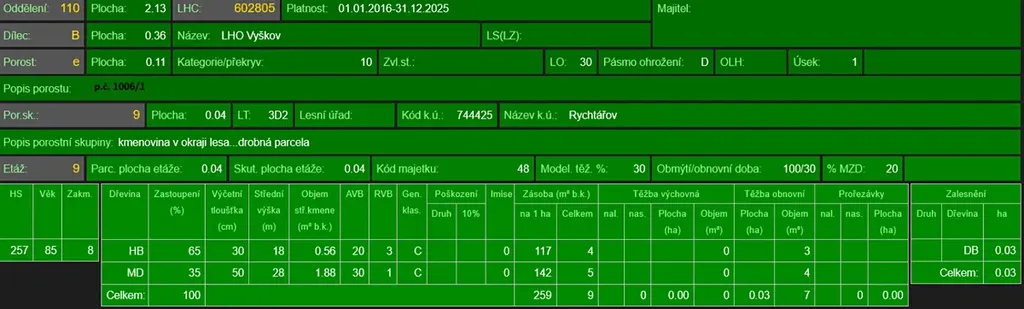 - p.č. 1006/1 vedená jako lesní pozemek o celkové výměře 1 060 m2 (stáří lesa 95 let - zastoupení dřevin habr, modřín, stáří lesa 32 let - zastoupení dřevin javor, habr).