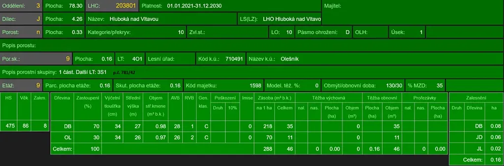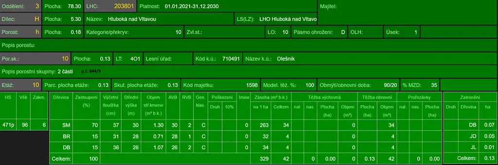 - p.č. 781/42 vedená jako lesní pozemek o celkové výměře 3 353 m2 (stáří 91 lesa let - zastoupení dřevin dub, olše, stáří lesa 40 let - zastoupení dřevin smrk),