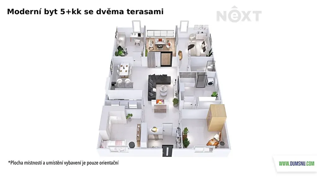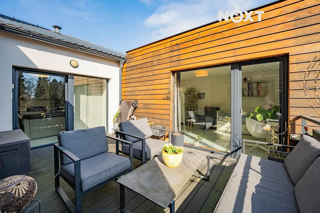 Velkou přidanou hodnotou bytu jsou dvě prostorné terasy, které dodávají bydlení jedinečný charakter. U vstupu do bytu se nachází terasa o velikosti 42 m², která vytváří příjemný a reprezentativní vstup do domova a umocňuje pocit bydlení v rodinném domě. Druhá terasa o velikosti 15,5 m² je přístupná ze tří místností a nabízí dostatek soukromí – ideální místo pro ranní kávu, večerní sklenku vína nebo klidný odpočinek.