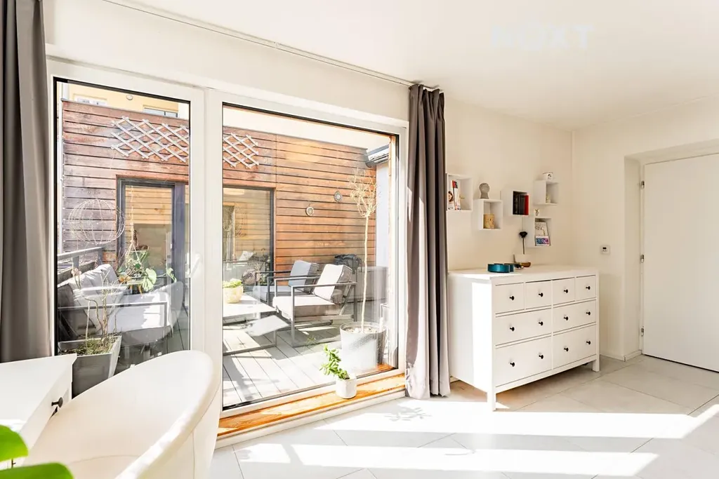 Velká francouzská okna zajišťují dostatek denního světla a zároveň umožňují přímý vstup na terasu z více místností, díky čemuž je byt krásně propojen s venkovním prostorem.