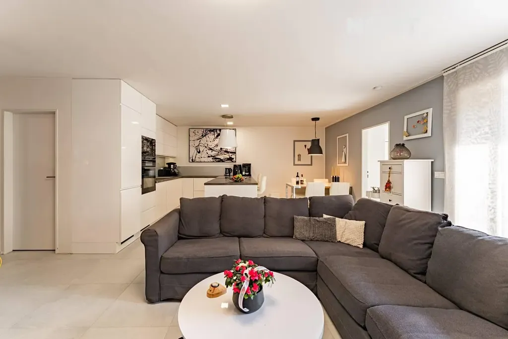 Dominantou bytu je velkorysý otevřený prostor obývacího pokoje s moderní kuchyňskou linkou a vestavěnými spotřebiči, který přirozeně propojuje kuchyň, jídelní část i obývací zónu. Celý prostor působí velmi vzdušně a nabízí dostatek místa pro rodinný život i setkávání s přáteli.
