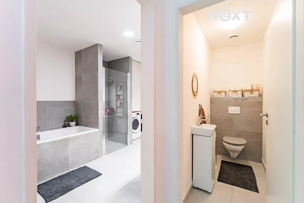 Byt disponuje dvěma koupelnami. V hlavní koupelně najdete vanu i sprchový kout. Druhá koupelna se nachází vedle ložnice, je z ní přístupná a je vybavena sprchovým koutem. Součástí bytu jsou také dvě toalety – jedna je samostatná a druhá je součástí koupelny.