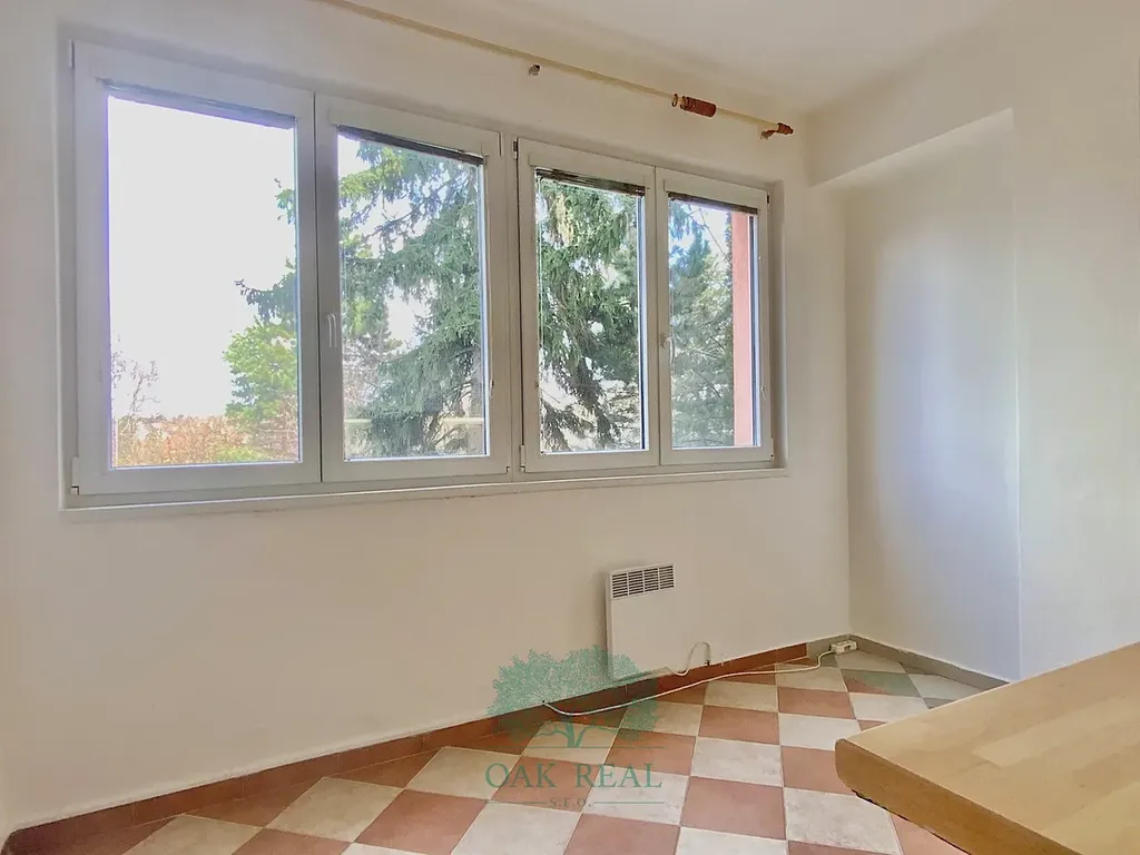 Jeden z pokojů má okno a lodžii orientovanou na jih s výhledem na Komenského náměstí. Díky zasklené lodžii je pokoj příjemně prosvětlený, zároveň je v letních měsících částečně chráněn vzrostlou zelení před domem. Druhý pokoj je orientován na sever do ulice Družstevní s výhledem do klidné zeleně. Také zde se nachází zasklená lodžie, která umožňuje její využívání i v chladnějších měsících. V případě potřeby lze tento pokoj propojit s kuchyní, která je oddělena pouze lehkou zděnou příčkou. Kuchyňská linka je plně funkční a vedle velkého okna je připraven prostor pro umístění lednice.