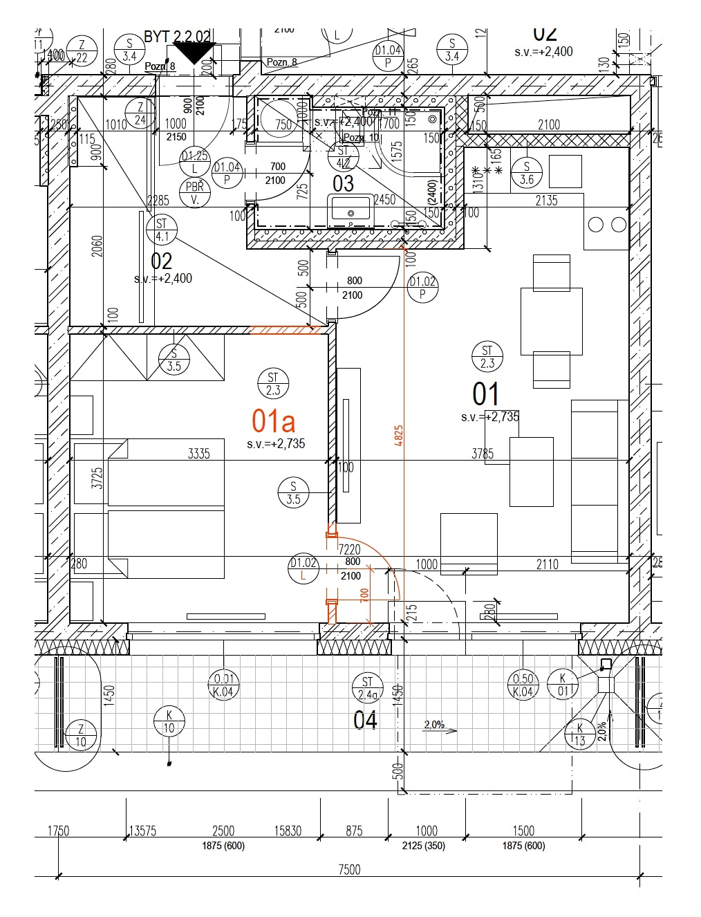Podlahová plocha bytu činí 47,7 m2, na kterou navazuje terasa o velikosti 9,4 m2. Hlavní obytný prostor je tvořen obývákem s kuchyňským koutem a přímým vstupem na terasu, přičemž ložnice je od obytné části oddělená a nabízí dostatek soukromí. Dispozice tak funguje prakticky a bez zbytečně hluchých míst.