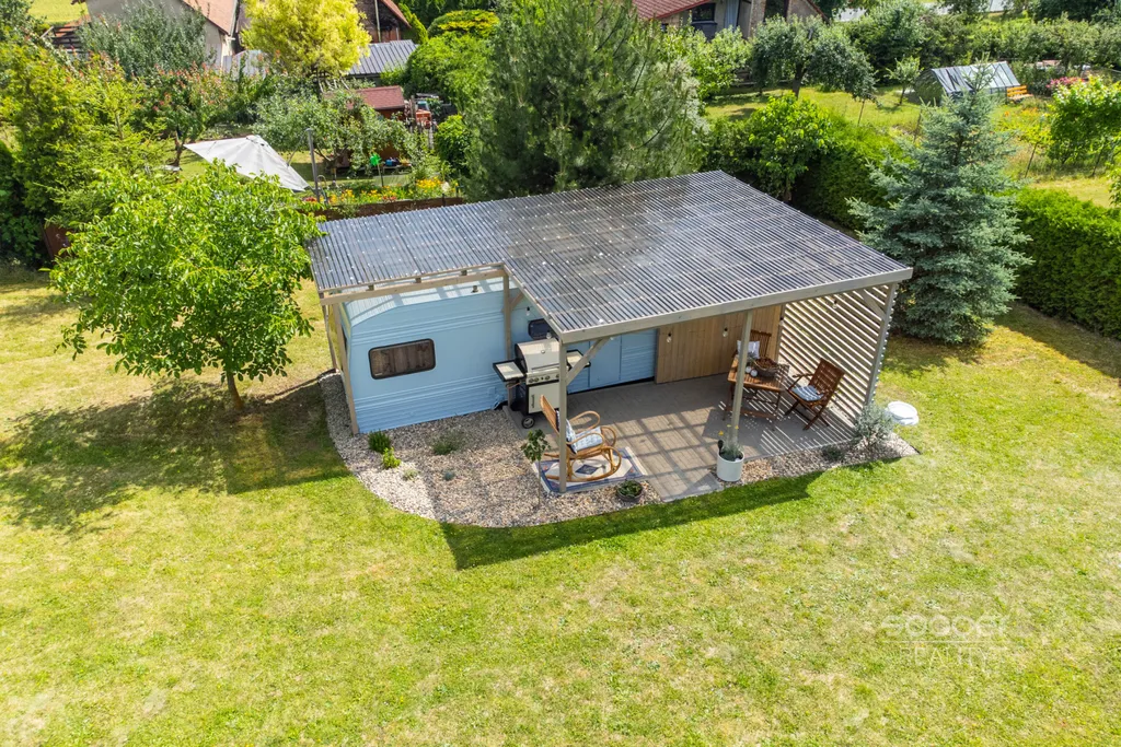 Pronájem prostorné zahrady s rekreačním karavanem a terasou, Dobrovice - Úherce, okres Mladá Boleslav, Středočeský kraj.