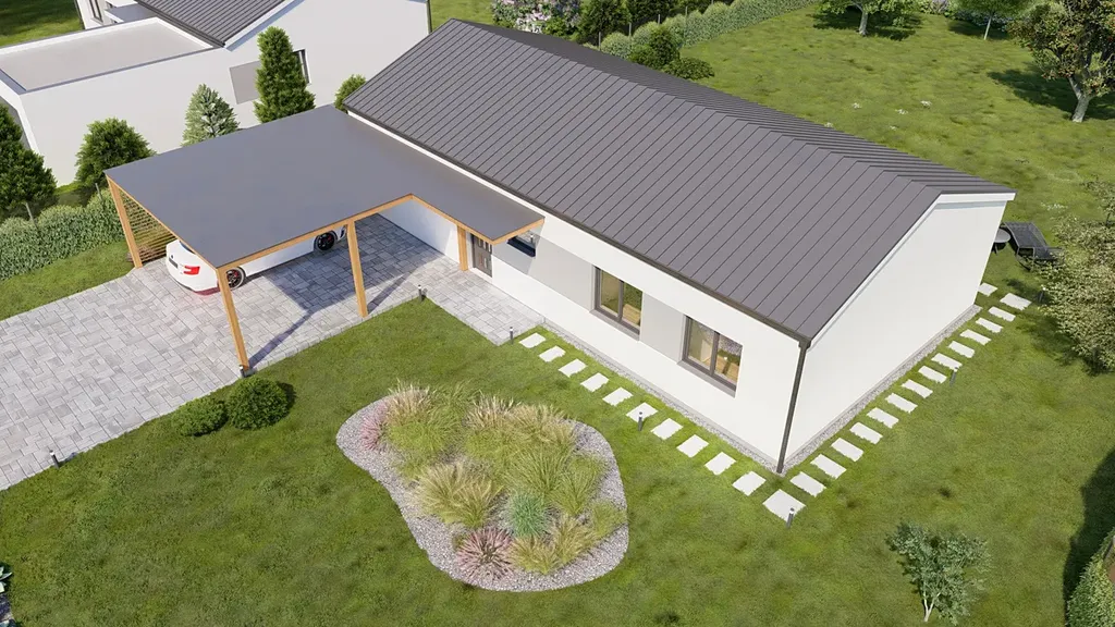 3️⃣ Premium - kompletně dokončený dům + přístřešek pro 2 vozy + krytý vstup.