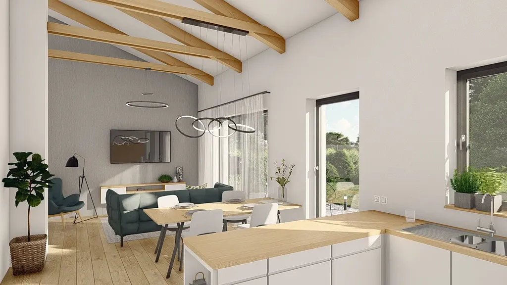 Otevřený strop v obýváku a přímý vstup na terasu – vzdušnost a světlo