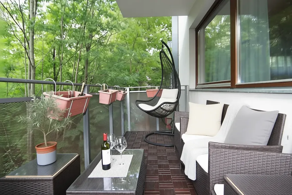Balkon s výhledem do parku: Balkon s výhledem do zeleně nabízí možnost odpočinku v klidu přírody.