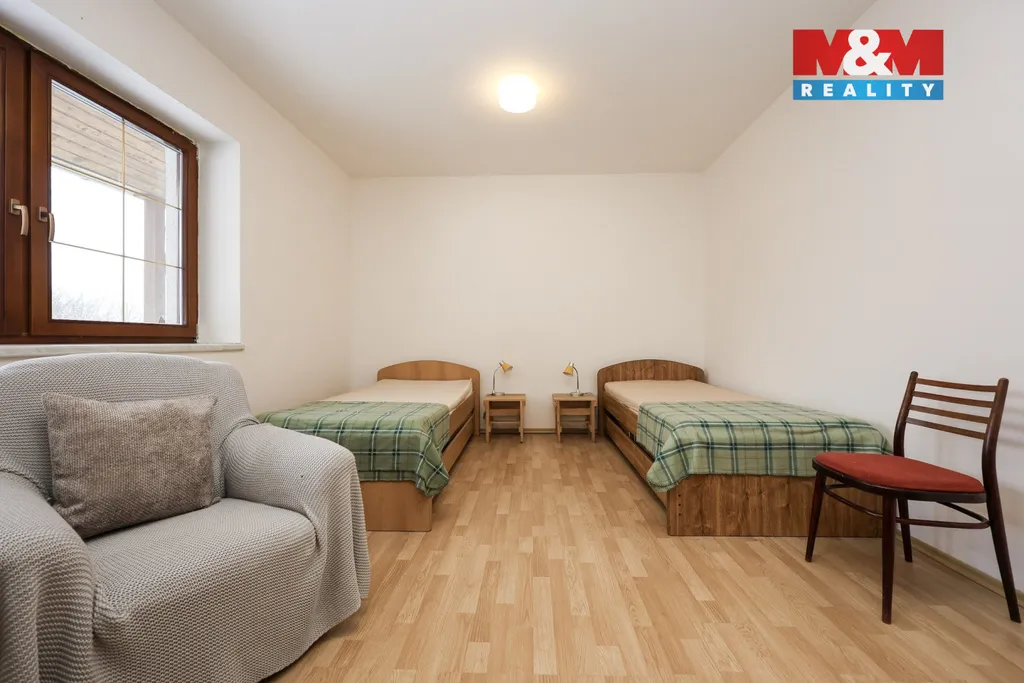 V 1. patře jsou čtyři samostatné pokoje, každý se dvěma lůžky, koupelna se sprchovým koutem, samostatné WC a prostorný balkón s výhledem do přírody.