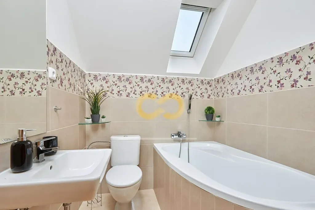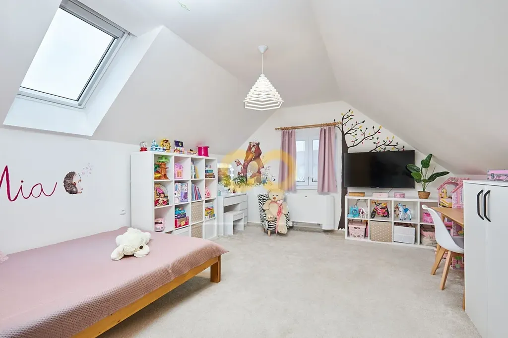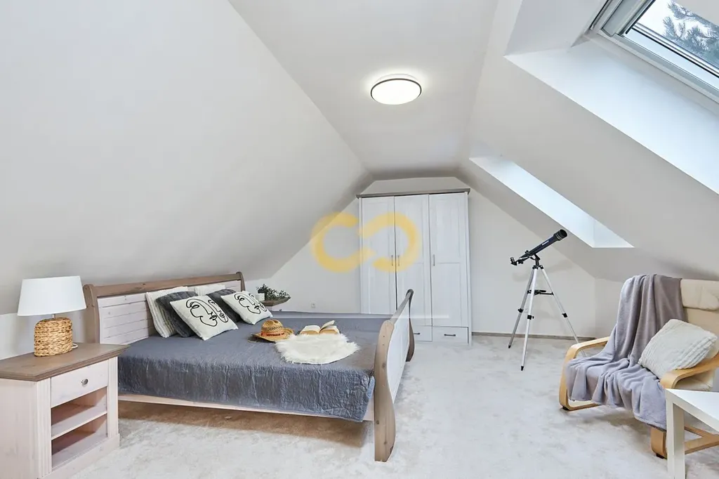 Po schodech vystoupáte do patra, kde jsou další 2 ložnice s výměrou 22 m2, k tomu šatna a malá pracovna. V koupelně v patře je rohová vana a toaleta.