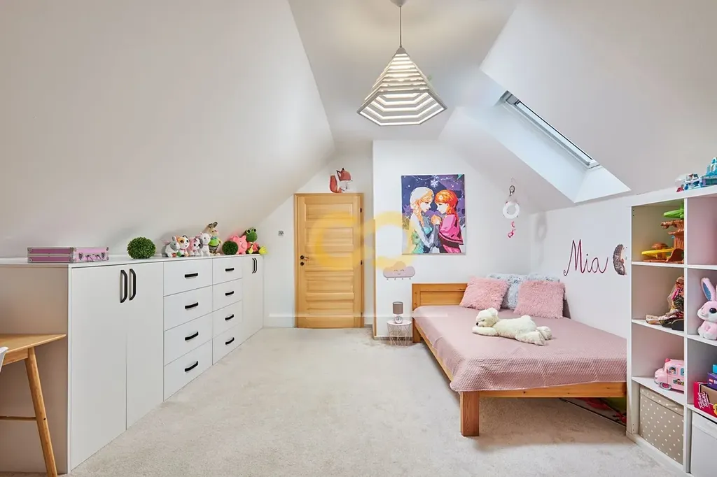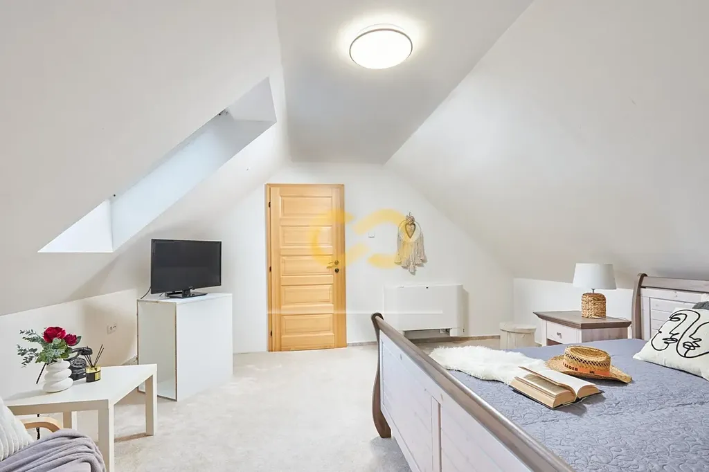 V domě jsou celkem 4 pokoje a 2 koupelny. První ložnice je v přízemí a kromě velké šatny s technickou místností má taky vstup na zahradu. Vedle ložnice je koupelna se sprchovým koutem a toaletou.