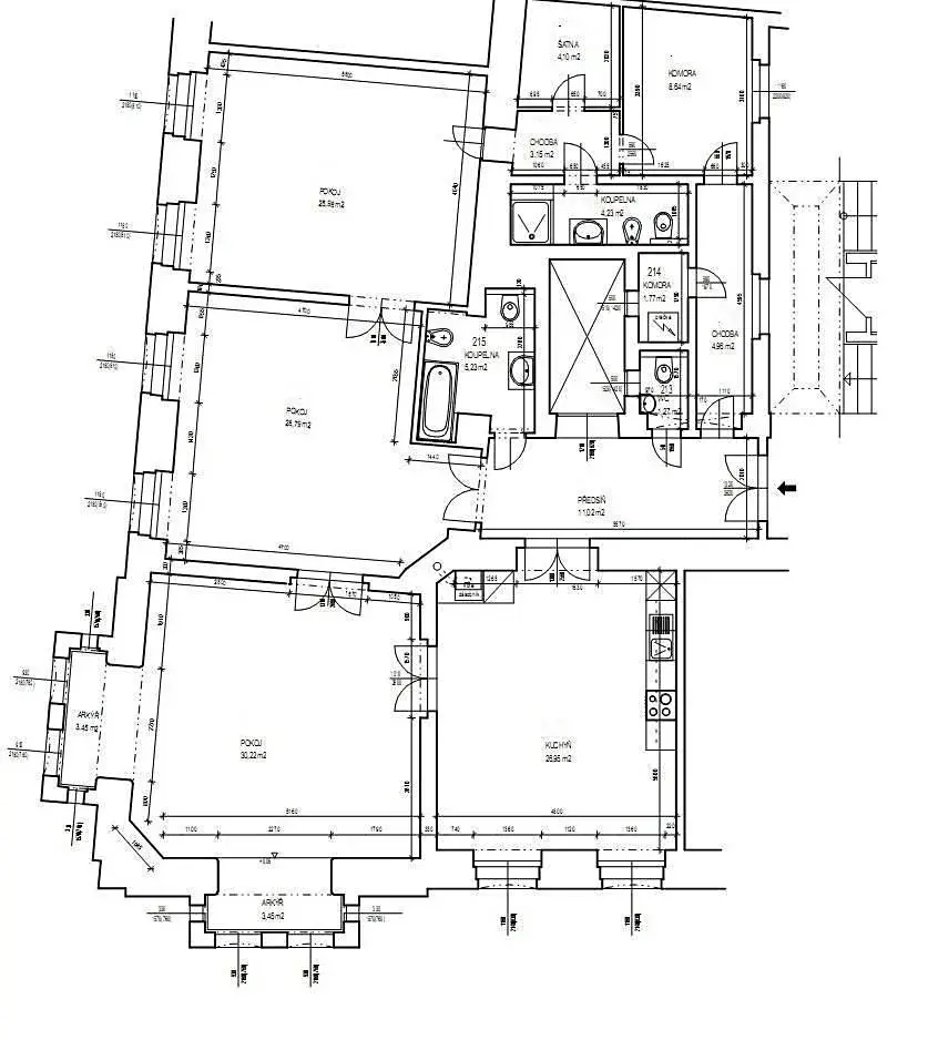 Prostorný apartmán nabízí dispozičně: obývací pokoj s arkýři, separátní kuchyně s veškerým vybavením (lednice/mrazák, sporák/trouba, myčka). Kuchyň bude ještě dokončena honí skříňky, lednice + ostrůvek. Dále byt nabízí tři ložnice, dvě koupelny (v jedné vana a ve druhé sprcha), šatna, oddělená místnost s pračkou a se sušičkou.