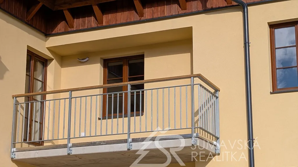 Dominantou bytu je prostorný balkon o velikosti 7,3 m² orientovaný na jihozápad, který nabízí krásný výhled na Šumavu a dostatek slunce po většinu dne. Obývací pokoj s francouzskými dveřmi na balkon plynule navazuje na kuchyňský kout umístěný v praktickém zálivu. Ložnice má vlastní okno směrem na balkon, což zajišťuje příjemnou atmosféru i dostatek světla.