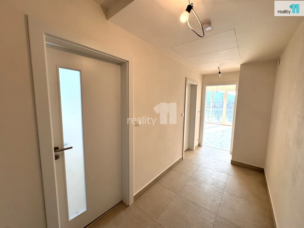 Nezařízený byt, s výměrou 53.7 m², je dispozičně rozdělen na vstupní chodbu, ze které se vchází do slunného obytného pokoje, kde bude nová kuchyňská linka na míru (bude zde varná deska, trouba, myčka), se střešními okny a vstupem na prostorný balkon (výměra 11.4 m²). Samostatná ložnice, koupelna s vanou a toaletou. Do chodby je plánovaná vestavná skříň. V celém bytě použity kvalitní, moderní materiály v neutrálních barvách - dřevěné podlahy, rekuperace, podlahové topení v koupelně, klimatizace. Velkou výhodou bytu je úložný prostor přístupný sklápěcími schody přímo v bytě, dále velký zděný sklep a vlastní parkovací stání.