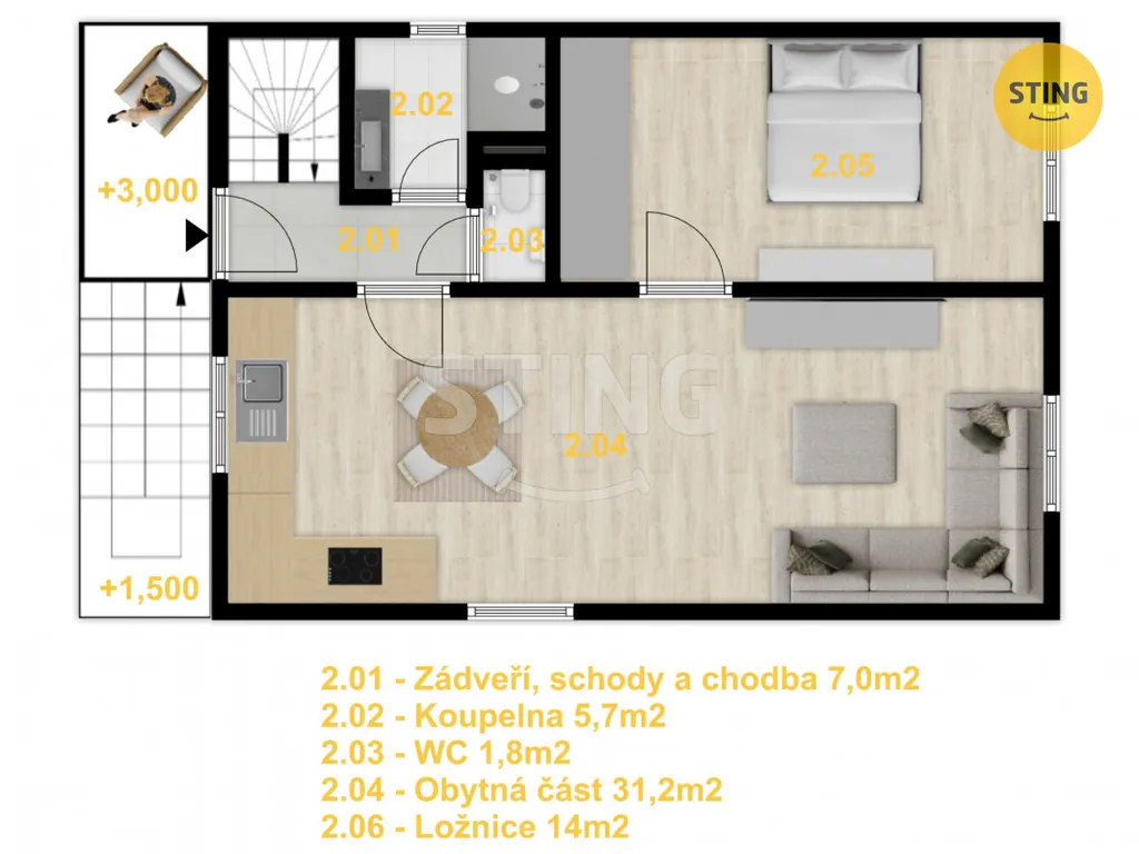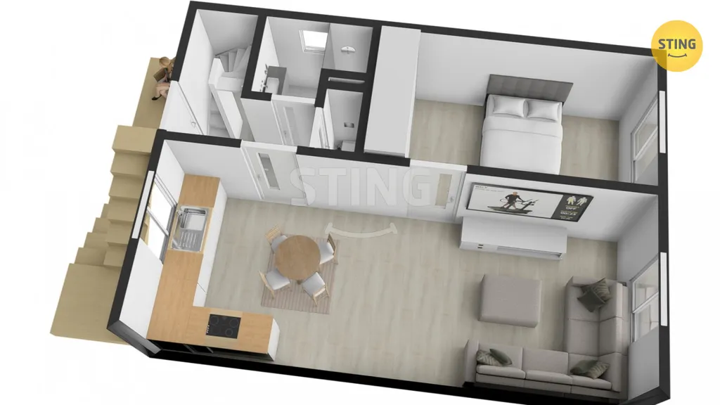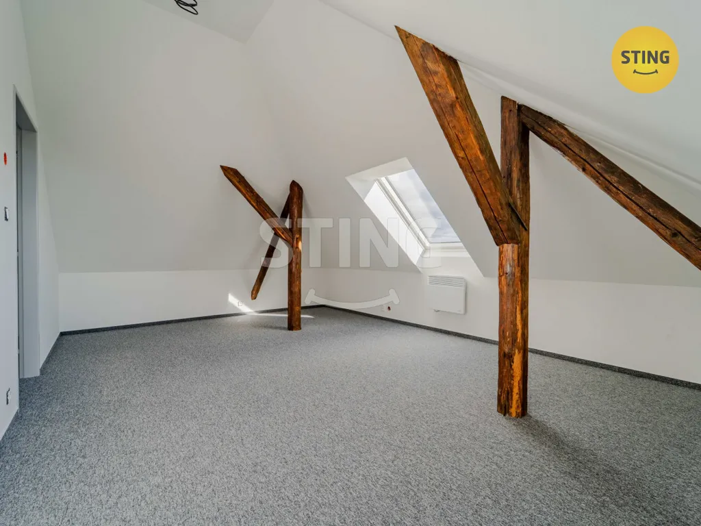 Dispozice bytu tvoří vstupní chodba, obývací pokoj s kuchyňským koutem, samostatná ložnice, koupelna se sprchovým koutem a samostatné WC, ze vstupní chodby vede schodiště do podkrovím kde se nachází 2 samostatné ložnice. K bytu náleží vyhrazené parkovací místo a v suterénu domu se nacházejí sklepní prostory poskytující dostatek úložného místa.