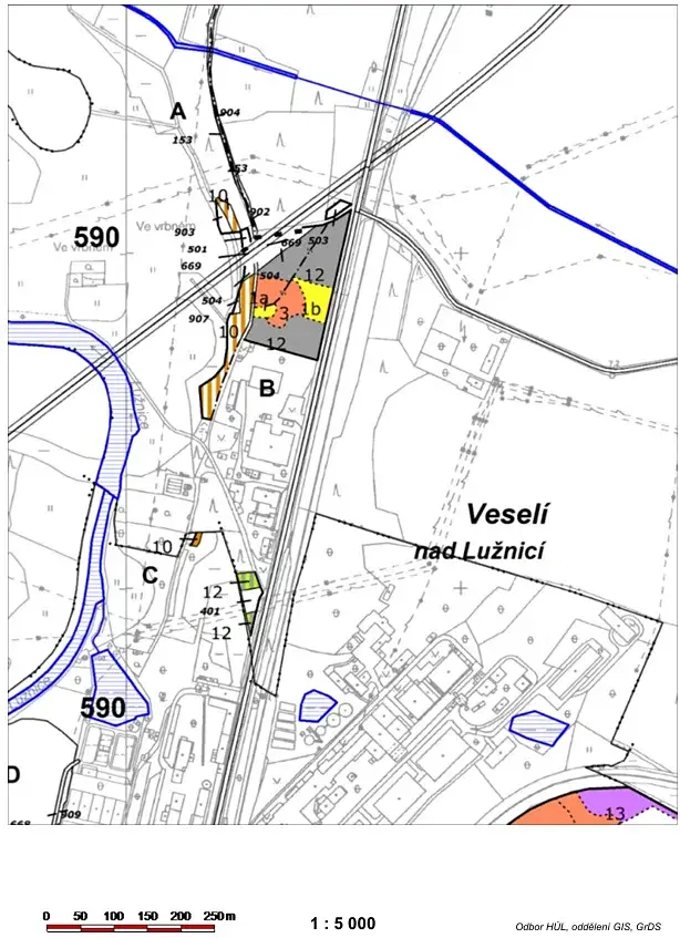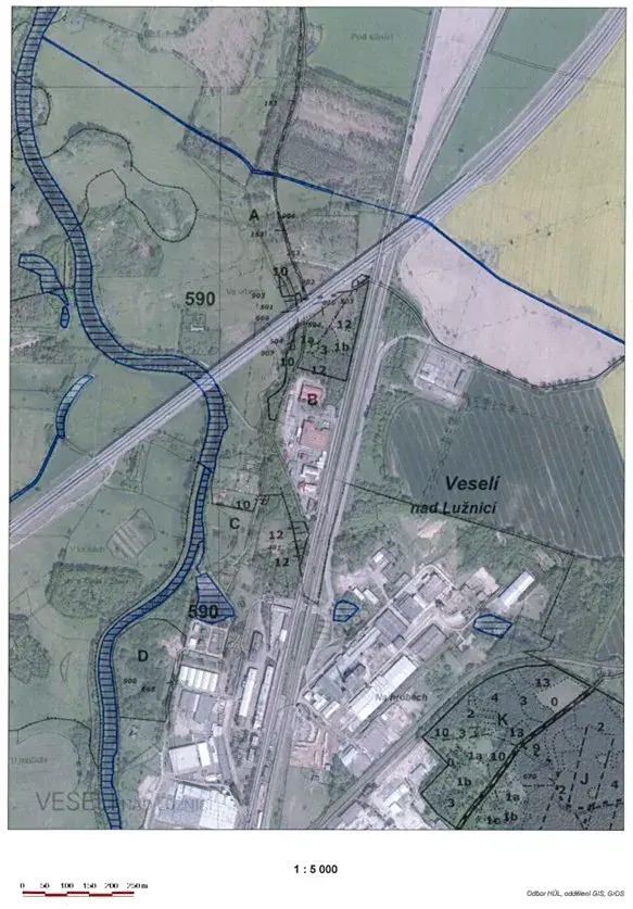 Jedná se o pozemky na okraji průmyslové zóny města Veselí nad Lužnicí, mezi silnicí, železničním koridorem a dálnicí. Předmětné pozemky se nacházejí v nezastavěném území, jsou však dotčeny ochrannými pásmy železniční dráhy a komunikace, ochrannými pásmy plynovodu, vedením elektrického vedení a jeho ochranným pásmem a přes některé pozemky prochází záměr vybudování cyklostezky, konkrétně přes pozemky KN 1213/1 a KN 1213/14. Přes pozemky KN 1184/15, 1213/1, 1213/5, 1213/14 prochází m.j. záměr WT4 - vedení velmi vysokého napětí 110kV Kočín - Veselí nad Lužnicí.