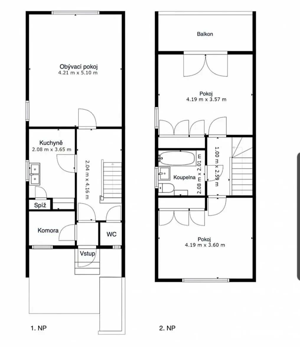 Přízemní část domu nabízí vstupní chodbu, obývací pokoj, kuchyň, koupelnu s vanou, samostatnou toaletu a schodiště, kterým se dostaneme do horního patra. V horním patře nalezneme 2 pokoje, koupelnu se sprchovým koutem a toaletou.