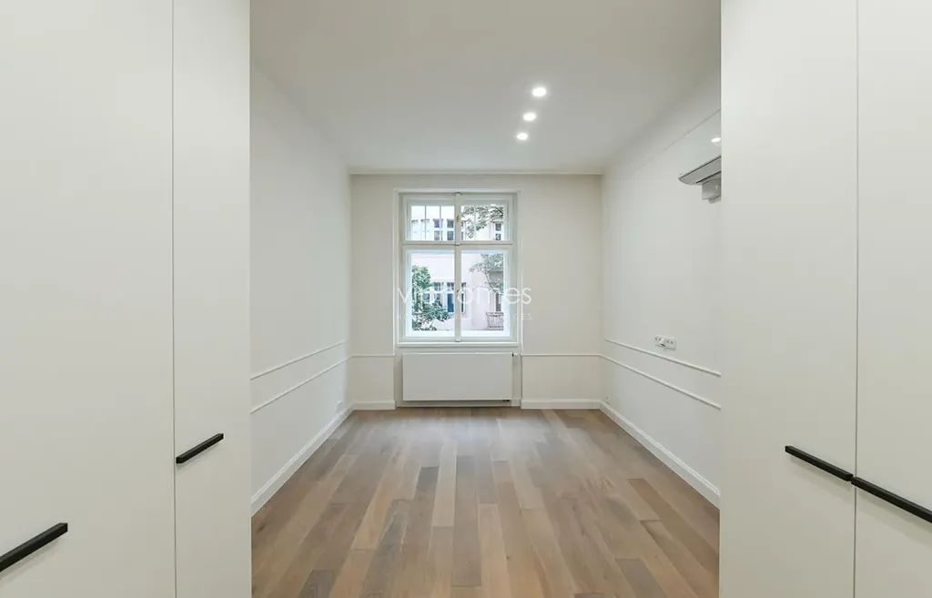 Interiér bytu velikosti 118 m2 tvoří vstupní hala vybavena vestavěnými skříněmi z masivního dřeva, moderně propojený obývací pokoj s kuchyní, 3 prostorově velkorysé ložnice, balkon, 2 minimalisticky pojaté koupelny s příslušenstvím, technické zázemí. Kuchyňská linka vybavena všemi potřebnými spotřebiči včetně vinotéky, Dřevěné dubové podlahy, nová okna s dvouvrstvým sklem a klimatizace. Volný od 1.6.26.
