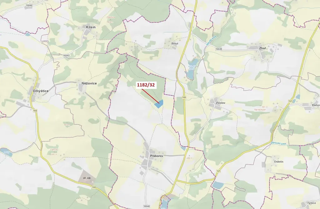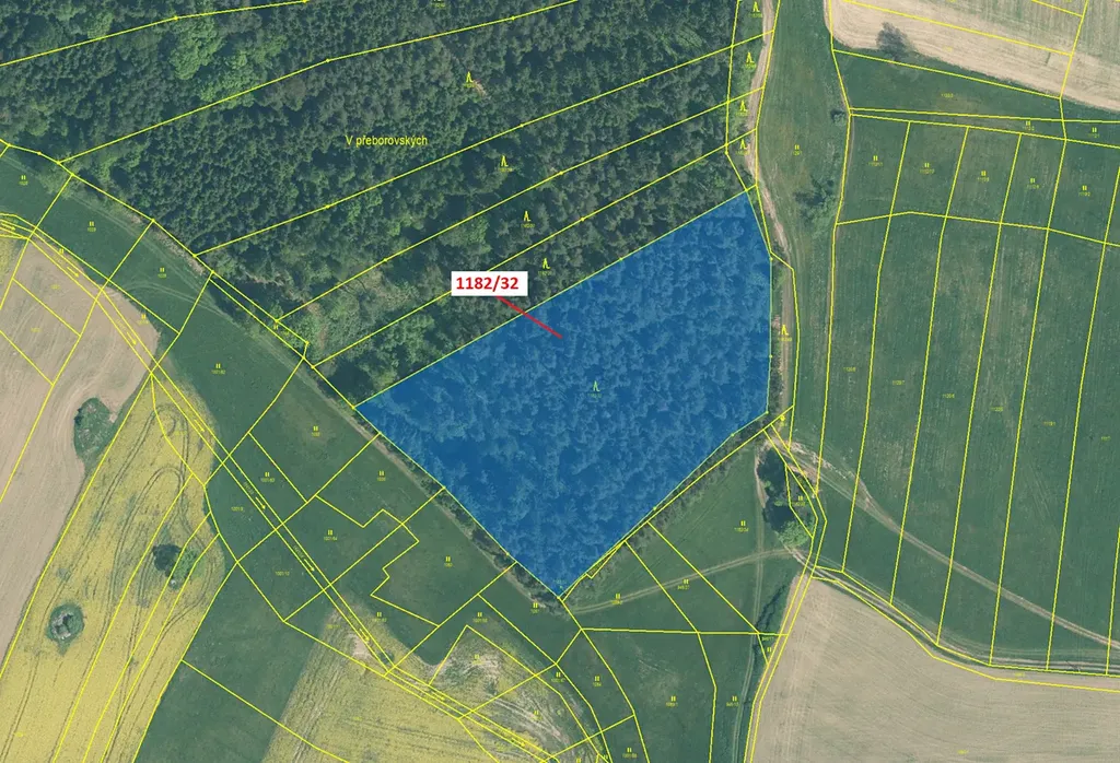 Lesní pozemek o výměře 16 134 m2, parcelní číslo 1182/32, podíl 1/1, katastrální území Přeborov, obec Přeborov, obec s rozšířenou působností Milevsko, okres Písek, Jihočeský kraj. Po těžbě.