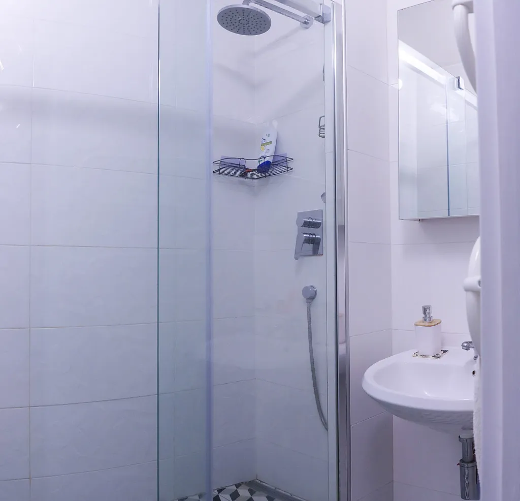 Koupelna je řešená moderně – místo vany je zde bezbariérová sprcha (walk-in), která je praktická, bezpečná a snadná na údržbu.